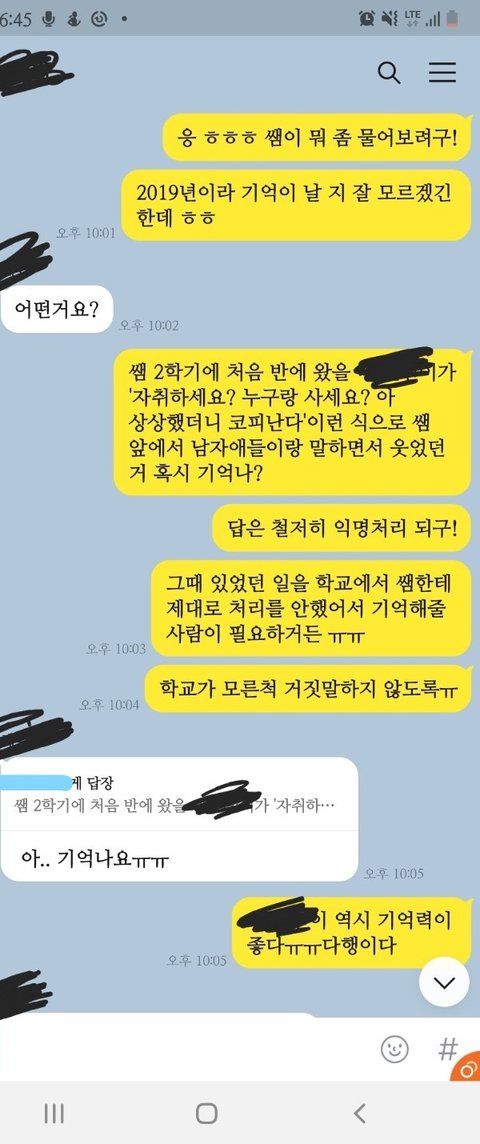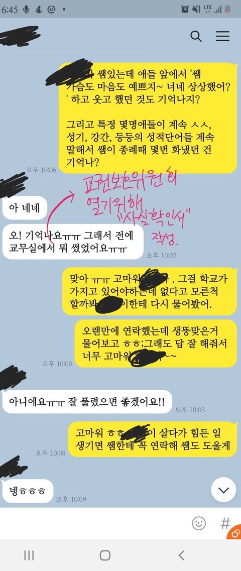 학생들의 증인 진술 카톡으로 있습니다. 언론사에 증거와 함께 제보해놓은 상태이고 기사 나오기를 기다리고 있습니다..