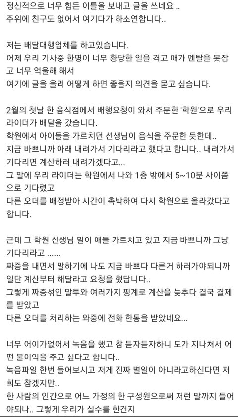 아래에는 해당 배달전문업체 기사님 사연 첨부합니다