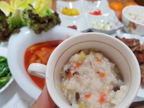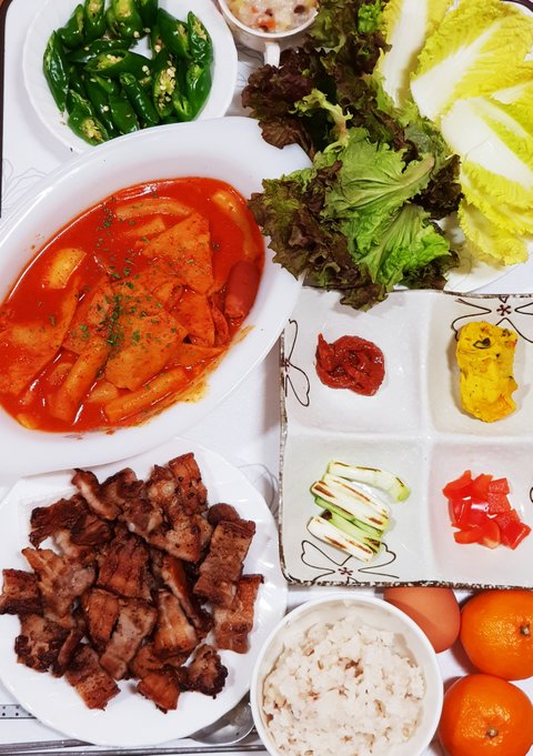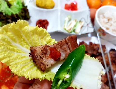 삼겹살 쌈밥에 쌈장에 찍은 청양고추 한입
