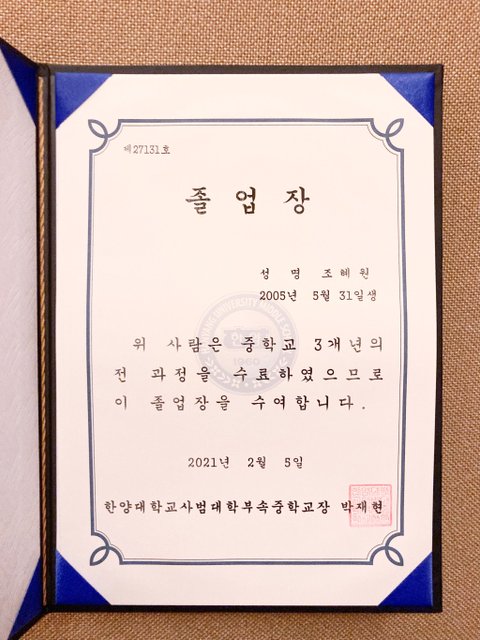 울 혜원이 2021년도 한양대학교사범대학부속중학교 졸업생이라 오늘 중졸사가 떴음 ㅋㅋㅋㅋㅋ