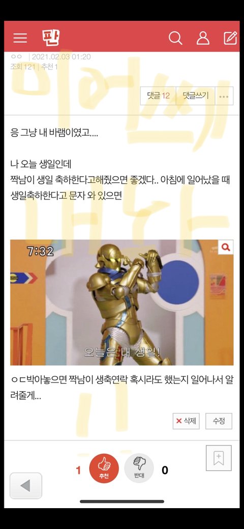 아침에 일어나서 보니깐 톡 와 있더라 한 네줄 정도 썼던데 뭔가 고맙고 미안하고 보고싶고 되게 복잡한 마음이 들더라 나만 좋아하는게 힘들어서 반포기한 상태였는데 오늘 뭐 할거냐 요즘 잘 지내냐 물어보면서 대화 이어나가더라 고맙고 음 이 기분을 뭐라 표현해야할지 잘 모르겠음 ㅠㅠㅠㅠㅠㅠ