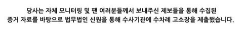 "당사는 자체 모니터링 및 팬 여러분들께서 보내주신 제보들을 통해 수집된