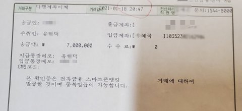 우체국 유*덕 이라는 계좌로 돈이 이체되었으며,