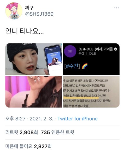 이러다가 점점 사람들이 수진한테 괜시리 아 저런애구나 하고 인식 박히면 어쩌려고;; 개심각함 저 인용트윗에 머라하는사람 잇을줄 알았는데 다 "얘는 찐이야" 이러고있음