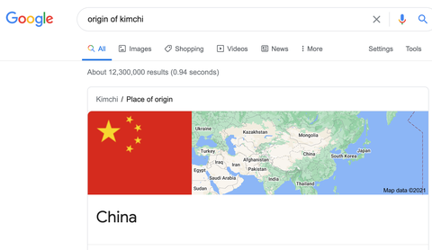 구글에 origin of Kimchi (김치의 본고장) 검색하면 China라고 나와