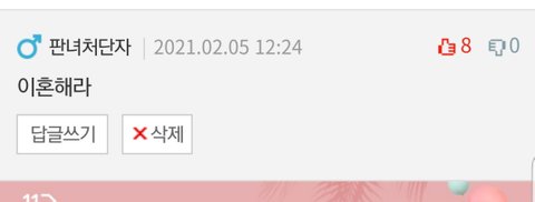 나 판녀처단자라고 여기 댓글쓰면 판녀들한테 맨날 반대에 욕만 먹거덩 닉네임부터시작해서 심지어 부모님 욕까지해 근데 왜 내가 판녀들이 쓴글에 글내용도 안보구 묻지도 따지지도 않고 이혼하세요 헤어지세요라고 댓글달면 왜그렇게 추천해줘? 이거 니들진심이야 아니면 판녀들 다 이혼하고 헤어지게하려는 여적여야? 난 여적여라고 생각하고는 있는데 갑자기 니들 생각이 궁금해서 솔직한 답변부탁해