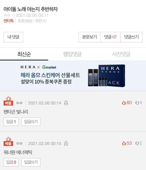 엔터에 베플 첫번째 두번째가 후이가 만든 노래다