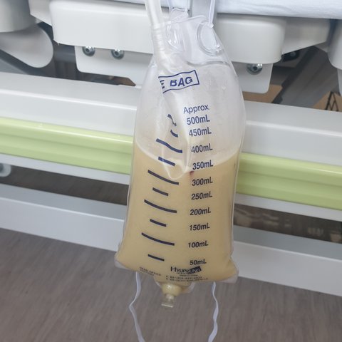 알고보니 수술 봉합부위에 누출(구멍)이 생겼지만 수술한 병원에서는 수술 후 조형제 검사까지 했음에도 불구하고 문제를 잡아내지 못하였고 덕분에 아무것도 모른체 퇴원조치 후 집에 돌아와서 섭취한 두유, 우유등이 누출이 생긴 구멍을 통해 복막안으로 흘러나와 현재 복막염까지 진단받았으며 배에 또다시 구멍을 뚫어 배액관을 두개나 꼽고 복막안에 누출된 음식물과 피고름등을 뽑아가며 이모병원 에서 치료받고 있습니다.