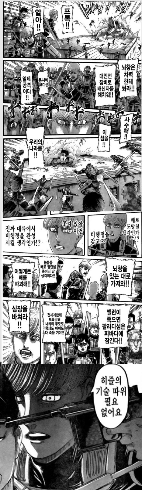 엘빈의 스스메 신조오사사게요는 소름끼치도록 숭고하고 자유를 향한 의지가 동경스럽기까지 한데 프록이 예거파한테 외치는 심장을 바쳐라는 인간의 의지보다는 광적인 생존본능이 보임.. 어느한쪽이 더 좋다는게 아니라 의미가 다른게 인상깊음