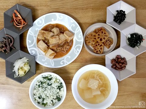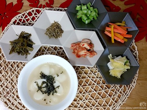 떡국은 밑반찬으로 김치 한 가지만 있어도 한 끼 먹을만한데, 접시가 세개씩 붙어있다보니 강제로 반찬 가짓수가 늘어납니다.