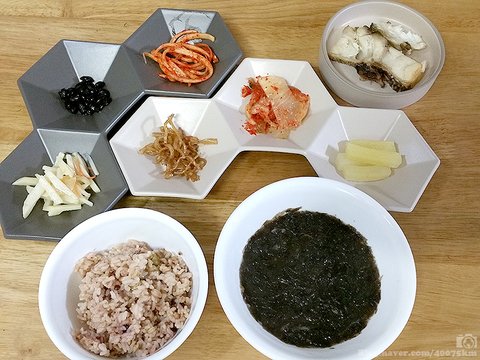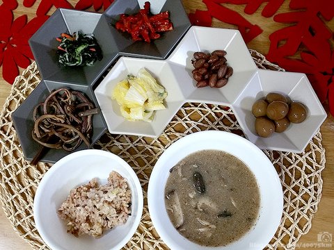 (잡곡밥, 버섯들깨탕, 마트표 고사리무침, 마트표 파래무침, 마트표 무말랭이, 마트표 백김치, 땅콩조림, 메추리알 장조림)