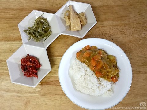 (카레라이스, 마트표 무말랭이 무침, 미역줄기 무침, 어묵 볶음)