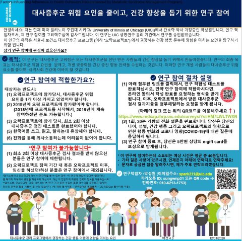 2019년 서울시 보건소 대사증후군 프로그램에 참여하셨던 분들을 대상으로, 건강 행동 요인을 탐색하는 논문을 작성 중에 있습니다.