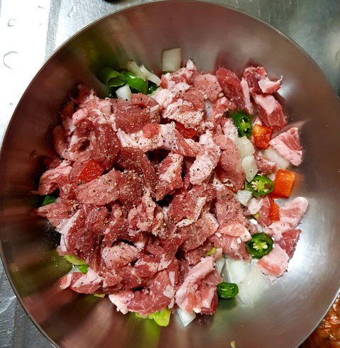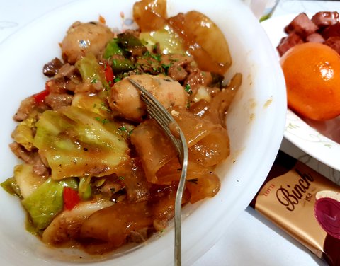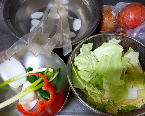 재료: 중국당면 가래떡 굴소스 다진마늘 맛술 스테비아 후추 양배추 알배추 양파 파프리카 대파 삼겹살 청양고추 저염비엔나