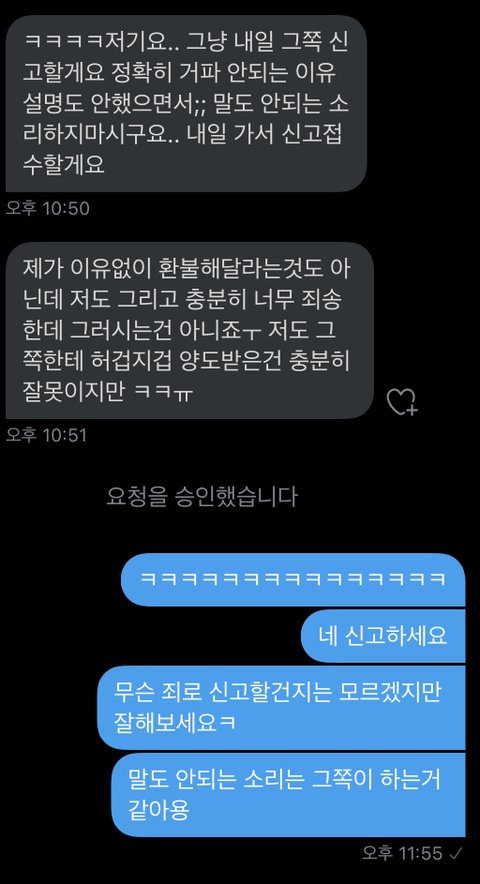 포카 사겠다고 해서 인증 다해주고 사기 요즘 많아서 번호까지 주라고 해서 다 줬음ㅋㅋㅋㅋ 근데 좀 이따가 자기 탈덕했으니까 갑자기 환불해달라고 하길래 내가 안된다고 했더니 경찰서에 신고하겠다는데 어떻게 해야함?ㅋㅋㅋㅋㅋㅋ