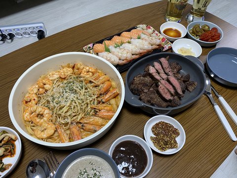 새우오일파스타, 소고기스테이크, 양송이스프, 초밥(은 이마트) 2인분