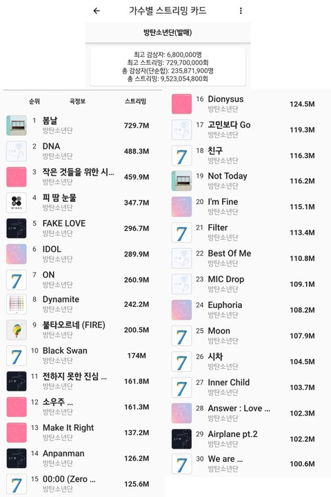 1. 방탄소년단 (30곡)