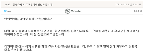 이제 됐니 억까들아? 잘 알아둬 이건 트와이스 잘못도 팬들 잘못도 아닌 일 드럽게 못하는 제왑이라는 회사 잘못이야. 이제 꼬투리 잡았다고 헤헤 거리면서 까는거 그만해라 ^^