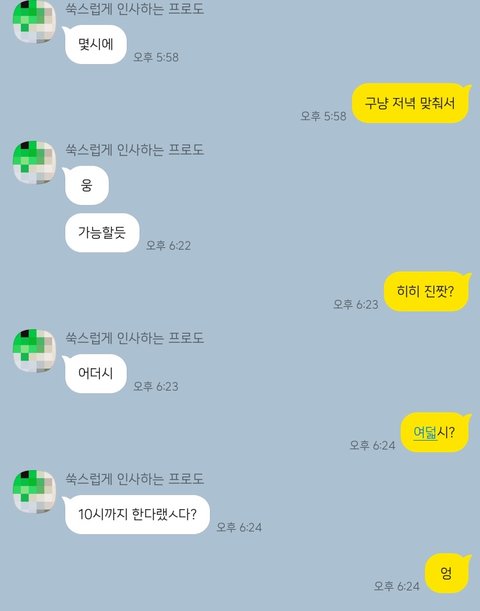 저기 어더시? 는 내가 처음에 여덟시라고 하는 건줄 알고 저렇게 답했음 지금 보니까 어디서냐고 하는 것 같긴한데... 내가 여덟시?라고 되물었는데도 별반응 없이 다른 얘기하기에 이게 맞나? 이렇게 늦게 만나자고? 생각 들었어