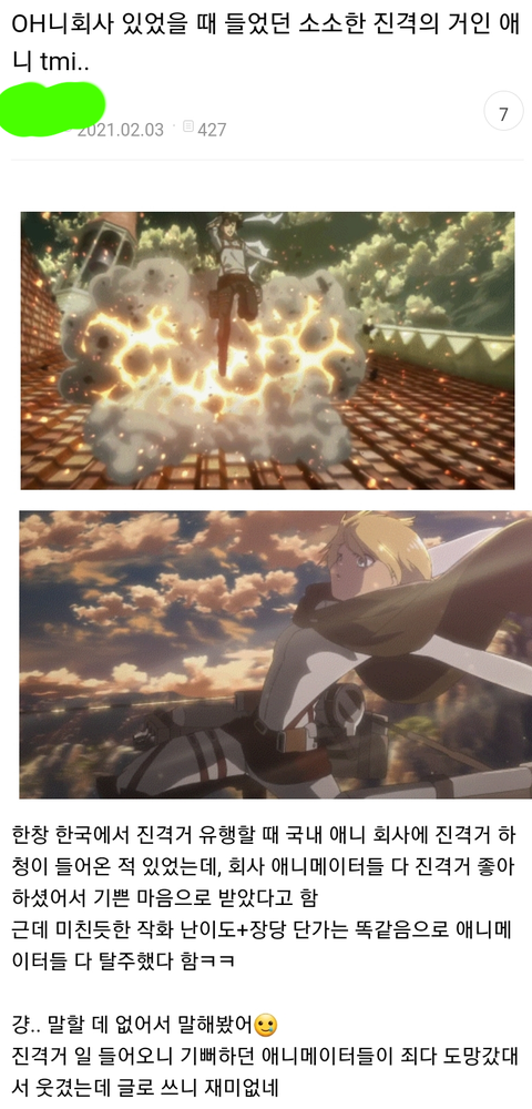 근데 진격 작화가 오지긴 햇구나... 애니메이터들이 인정할정도면
