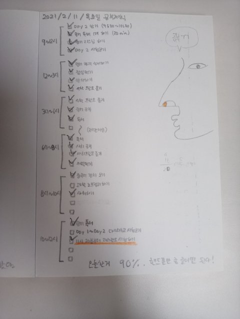 어제는 90% 달성률을 기록했다. 하지만 핸드폰을 8시간 넘게 봤다. 핸드폰 보지 말아야겠다. ㅇㄷ도 그만보고 ㅇㅌㅂ도 그만보고 ㅍ이랑 ㅇㅅㅌ도