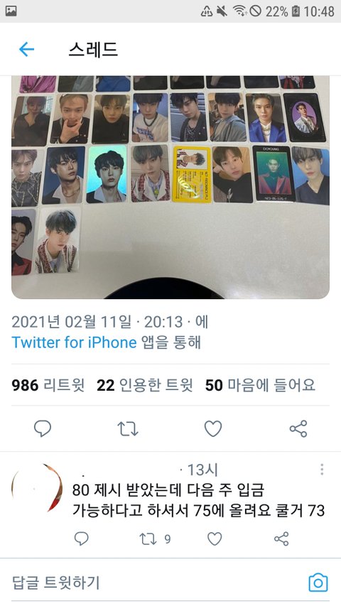 외국인이 사지도 읂을거면서 구라쳤거나 쟤가 구라치는 거 아니냐 시세 비싼 포카 하나 없는데... 난 쟤보다 양은 좀 적지만 좀더 비싼 포카들 팔아서 30에 팔앗는데