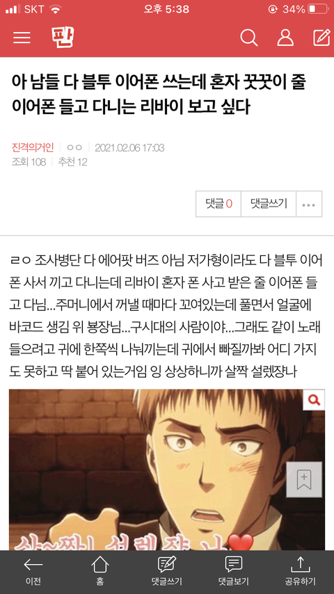 얘들아 나 예전에 리바이 줄 이어폰 썰 쓴 앤데 오늘 그걸로 에레리 써올게