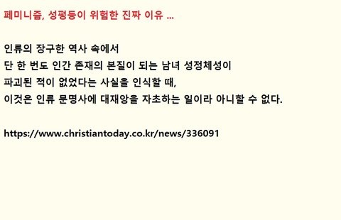 인류의 장구한 역사 속에서 단 한 번도 인간 존재의 본질이 되는 남녀 성정체성이 파괴된 적이 없었다는 사실을 인식할 때, 이것은 인류 문명사에 대재앙을 자초하는 일이라 아니할 수 없다.