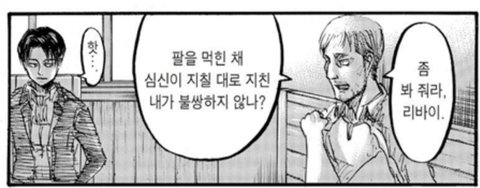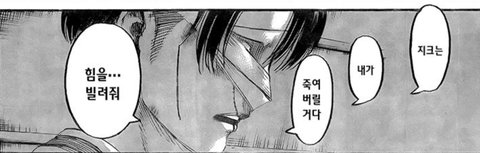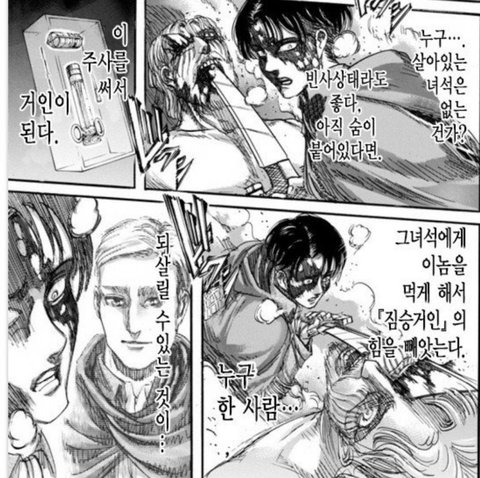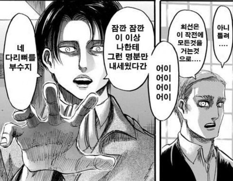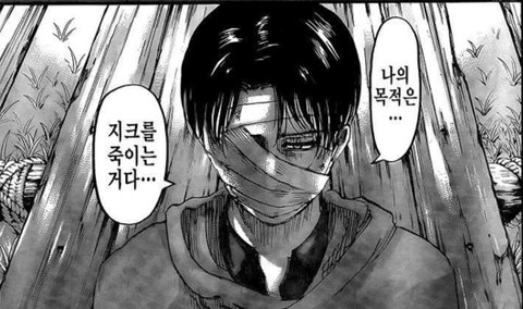 조사병단 파탄나고 옆에있는 한지 인류 멸망일지도 몰라서 멘붕인데 리바이는 혼자 에렌의 행보나 전세계의 인류따위 신경도 안쓰고 나의 목적은... 지크를 죽이는것이다 이러고있음