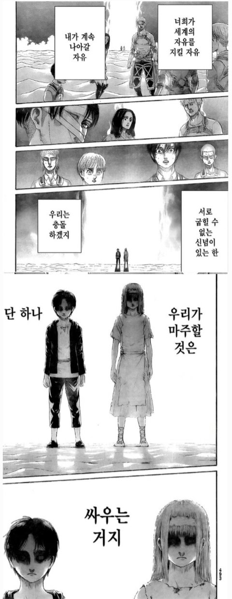 그리고 "너희들의 자유이니 우리는 필연적으로 충돌할수밖에 없다 그러니 나를 죽여봐라"는 말을 덧붙이는데 나는 여기서 에렌이 진짜 '이 한몸 바쳐 세상을 살리겠다'는 식의 영웅이 되려고 하는것같다고 느낌.