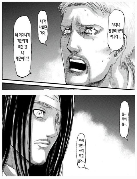 그래서 라이너가 에렌한테 절하면서 네 어머니가 죽은것도 자기 탓이라고 오열했을때 에렌은 라이너도 한명의 인간에 불과하다는걸 느껴서 용서할 마음이 들었는지 흠칫함
