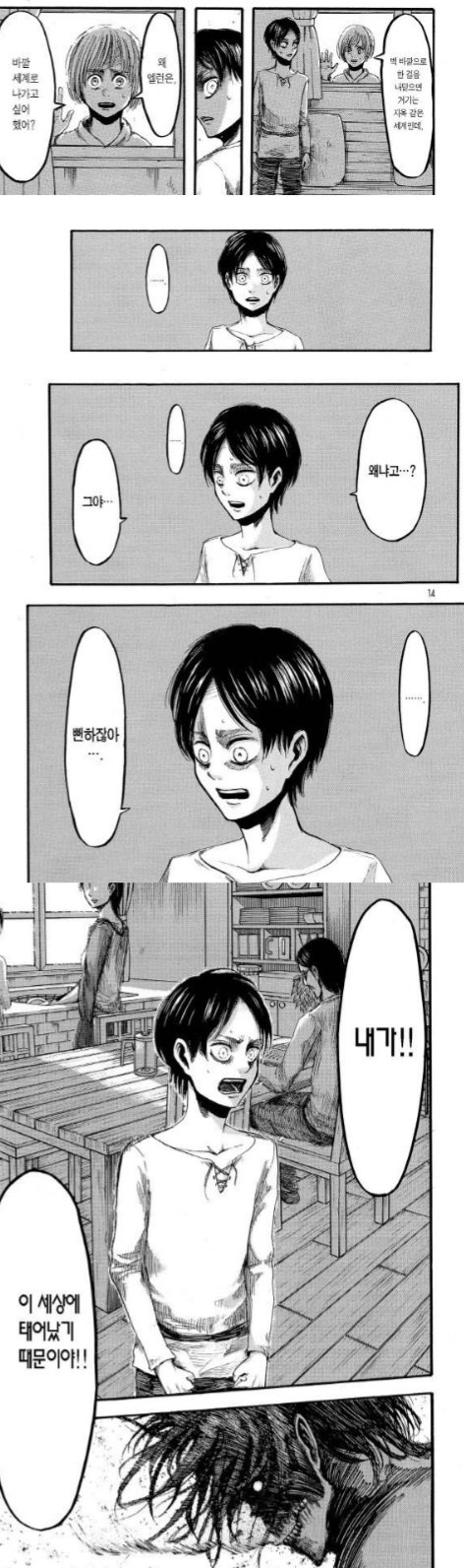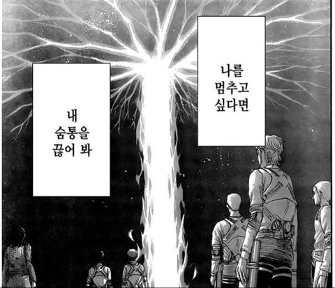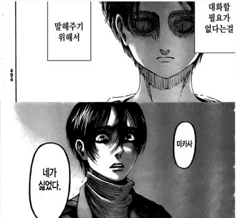 더불어 길에서 일방적으로 "너의 자유 나의 자유" 한다음에 "이제 더이상의 대화를 거부한다"고 한것도 다른사람들은 몰라도 아르민과 미카사라면 자신을 희생시킴으로서 세계를 구하는식의 작전에 동의해주지 않을거기 때문에 더 말해주려고 하지 않은거라고 생각함. 그래서 예전에도 조금이라도 정을 떼기위해서 미카사랑 아르민한테 미네싫 베뇌점 시전한거임