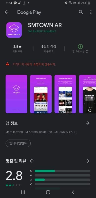 아니...비욘라 ar티켓 사서 그거 영상 보려고 smtown ar깔려고 하는데 검색해도 앱이 안나오는거야 그래서 qr코드 인식하는 앱 써서 링크 들어갔더니 내 폰 버전이랑 호환되지 않는대...어떡해..?