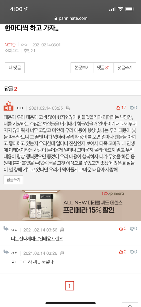 아까 온 태용이한테 온 버블이랑 툥프가 쓴 글 읽고 줄줄,,,