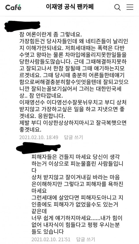 저 또한 한때 이재영 선수의 팬이었고 이재영 선수가 저런 나쁜 짓을 했다는 사실에 크나큰 배신감을 느꼈고 이 글을 쓰는 지금도 아직 화가 풀리지 않았습니다. 저 또한 학창시절 때 피해자 분처럼은 아니지만 괴롭힘을 당해본 기억이 있어서 어떤 아픔일지 공감을 하는 마음이기에 피해자 분들을 이렇게 위로합니다. 또한 피해자 분들께서 반드시 진심어린 사과, 그리고 7년 동안 힘들었던 것에 대한 보상을 받으시기를 바랍니다.