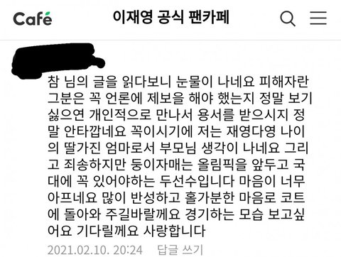 저 또한 이재영 선수를 좋아했던 팬으로서 비록 배신감은 남아있지만, 그래도 두 선수가 회개하고 용서받기를 원하는 마음은 있어서 팬카페가 이재영을 감싸는 것까지는 이해합니다. 하지만, 그러한 행위에도 선을 넘지 않는 한도 내에서 해야하는 것 아닌가요? 하다못해 "이재영 선수가 용서를 빌고 새로운 사람으로서 살아가기를 바란다" 이런 식으로 글을 올렸어도 이렇게 비판받지는 않았을 것입니다.