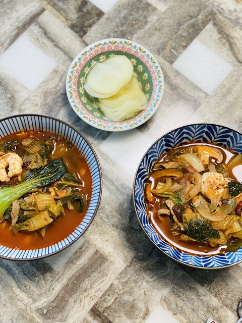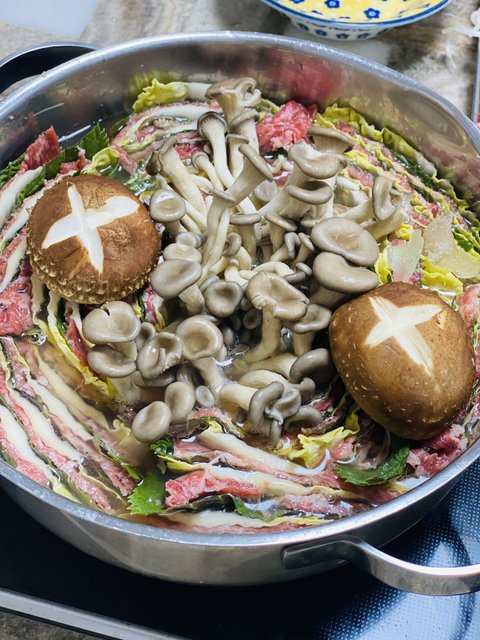 밀푀유나베가 급 먹고싶어 배추에 깻잎올리고 소고기 올려 겹겹이 쌓은다음 4등분해서 버섯 2종, 육수 넣고 샤브용 소스 좀 넣고 끓여 먹음. 건더기 좀 대충 다 건져먹으면 숙주나물, 남은 소고기, 쌀국수 넣어 먹으며 마무리. 맛 끝내줍니다..ㅎ