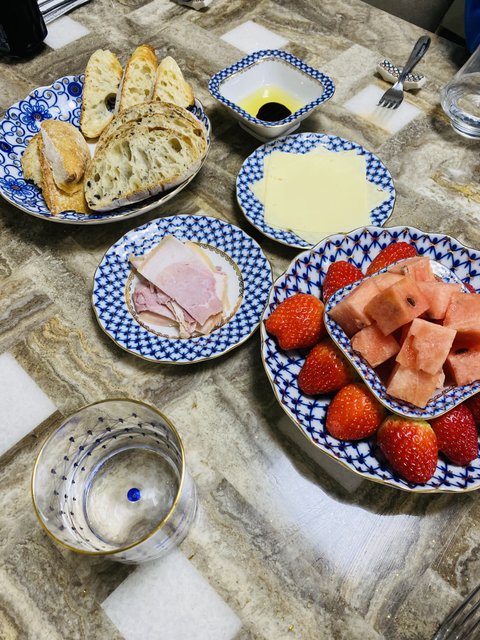 맛난 빵들 구매해서 잠봉(프랑스 햄)이랑 고다치즈랑 먹으면 꿀맛. 빵은 바게트랑 치아바타, 깜빠뉴. 과일 데코는 내가 시킨대로 남편이 해주심.