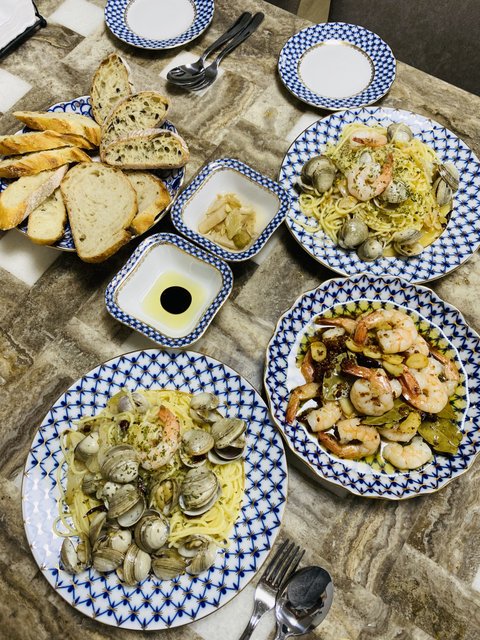 요날도 맛난 빵들이랑 알리오올리오 파스타, 감바스 알하이요해서 먹음. 감바스가 탱글하게 잘돼서 기분 좋았던 날.