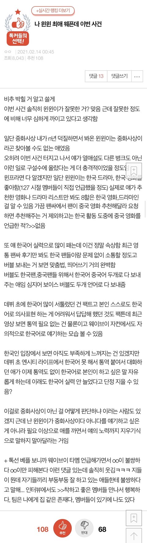지금 중국에서 진짜 작정하고 김치나 한복 같은 우리 문화들 다 뺏어갈려하니까 사람들이 조금 많이 예민하게 반응하는 경향이 잇음.. 그리고 판은 워낙 까는거 좋아하고 물타기도 심해서 그냥 저런 글은 당분간 트위터 비계 같은곳에 올려서 쩐니들이랑 도란도란 넋두리 하는게 좋을 듯..
