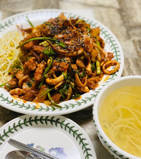 오삼불고기랑 콩나물국. 남편이 늘 엄지척 해주는 오삼불고기. 미나리 넣고 만들면 더 맛나고 없어도 맛남.