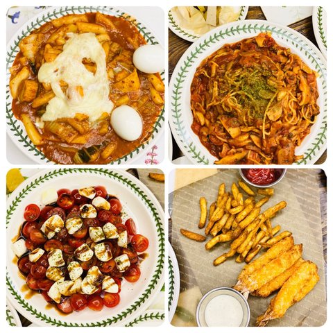이날 식사겸 술상은 토마토파스타랑 떡볶이, 카프레제샐러드, 감튀랑 새우튀김.