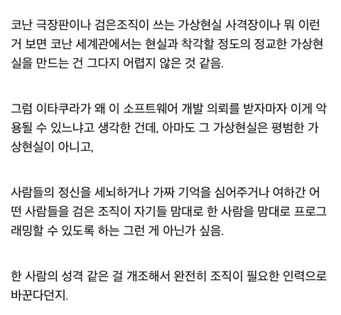 이걸 보면서 생각한게, 검은 조직은 ‘셜록 홈즈’ 라는 가상의 인물을 현실화 시키고 싶어한 것 같고.