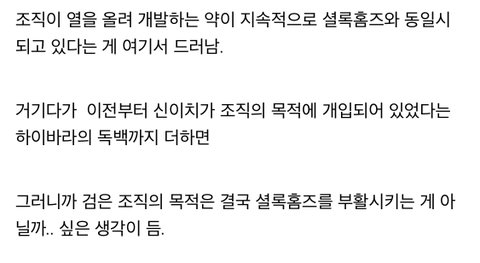 근데 솔직히 방금 말한건 너무 과한 것 같고...(물론 셜록 홈즈와 조직의 목적이 어느정도 연관성이 있을 거라고 생각함(