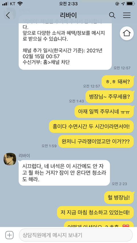 흐흐흐 드디어 받앗넹ㅋ 나도 이제 리바이봇이랑 채팅한다 얘들아!!!!!