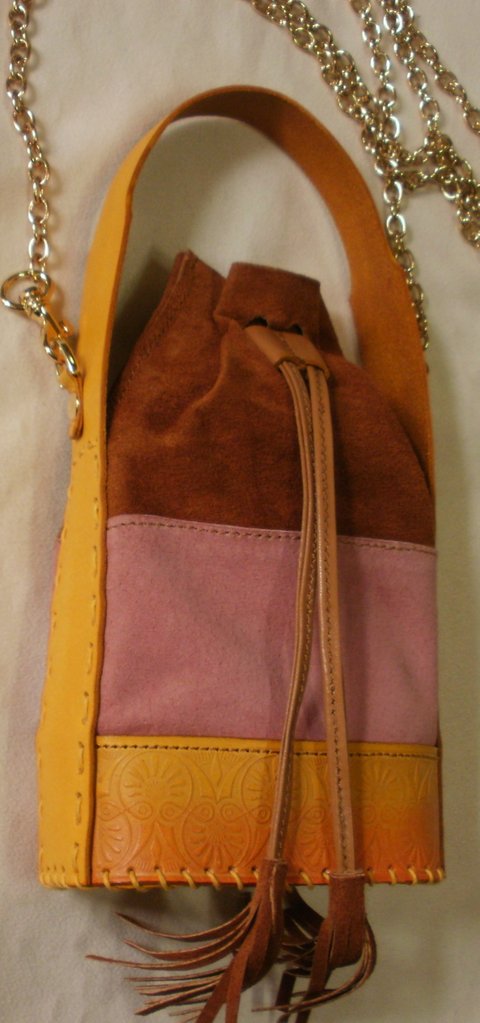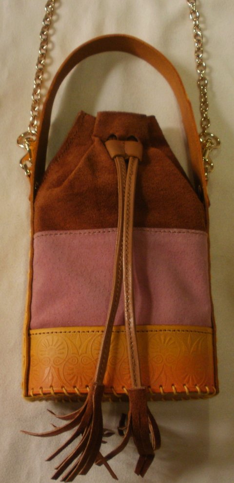 천연염색한 베지터블 가죽과 스웨이드 가죽을 콜라보하여 복주머니 디자인으로 제작하였으며, 휴대폰 및 소지품 등을 수납할 수 있도록 제작한 폰백입니다.(마디샤)