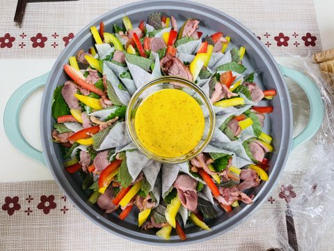 물에 데쳐서 건진 훈제오리와 파프리카 무쌈