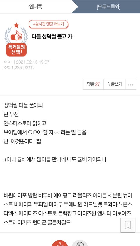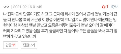 성덕썰인데 나도 저 댓글에다가 비투비에 관해 궁금한 거 ㄹㅇ 싹 다 물어봐야하나... 실물 후기 이런 거 말고도 궁금한 거 ㅈㄴ 많은데......
