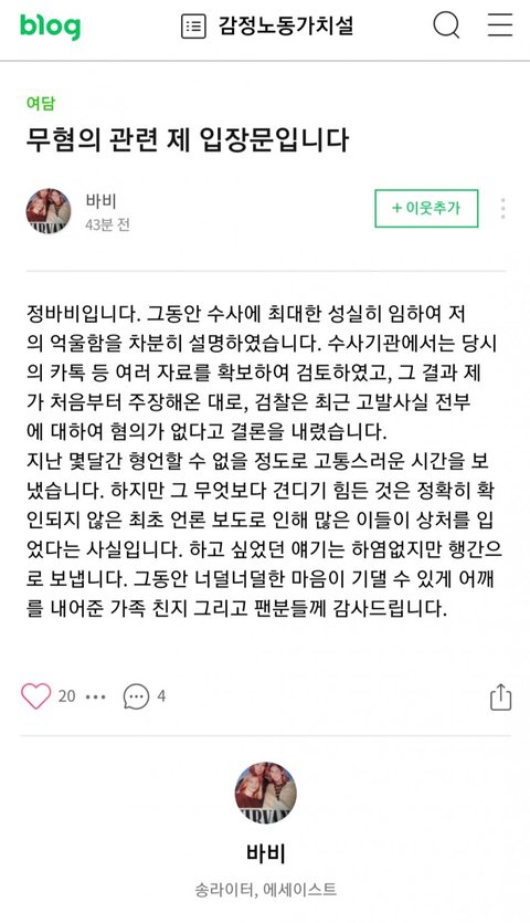 내가 법학과라서 아는데 왠만하면 무혐의 안나옴 ㅋㅋ cctv에 건물에 같이 들어가는 모습이 찍히거나 일관된 주장만해도 증거 불충분 나오는데 무혐의는 일관된 주장도 못했다는 거임;; 진짜 정바비 개불쌍하다.....