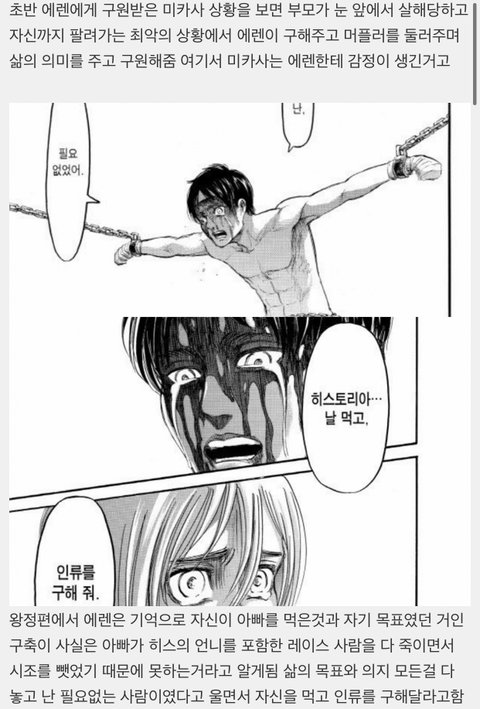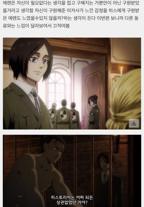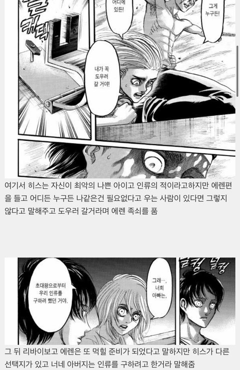 이번화보면 알겠지만 왕정편 이후로 에렌은 히스 희생만큼은 안시킬려고 혼자 노력한 사람임 그냥 구해지는거랑 구원받는게 다르기도 하고